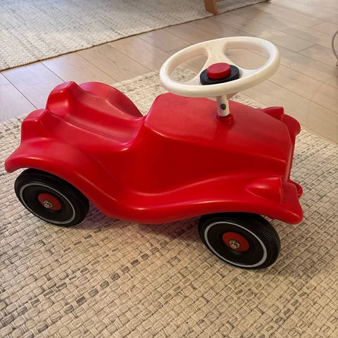 barnbil från Lekia i röd färg med vit ratt. Leksaken är utformad för barn och är gjord av plast. Den har fyra hjul och en enkel design för lek och rörelse.