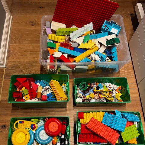 Osorterat Lego Duplo, ca 11kg med klossar, figurer, djur, bilar och byggplattor. Klossarna rengjorda inför försäljning och det medföljer en förvaringslåda i transparent plast (nyskick). Från ett djur- och rökfritt hem.