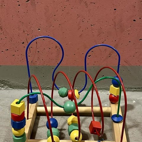 Aktivitetsleksak i trä och metall för barn. 30kr.