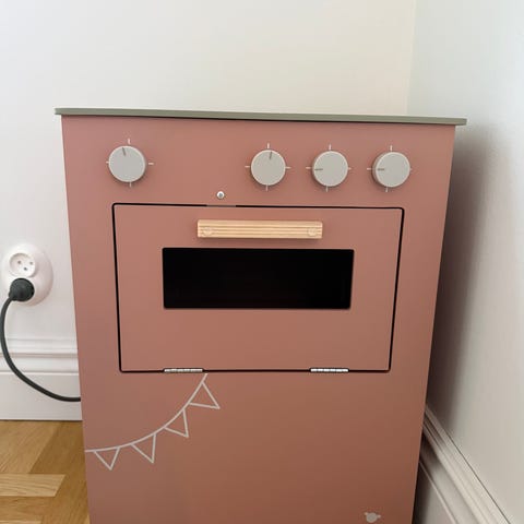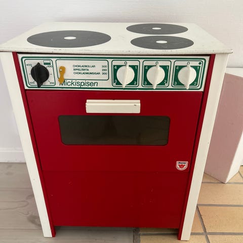 Micki spis med vridbara rattar. Ugnsluckan går att öppna. Fronten har varit trasig men är hoplimmad, sprickor syns vid sidan av rattarna. Två av rattarna har distinkta lägen medan övriga vrids steglöst.