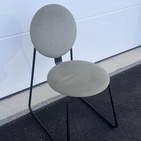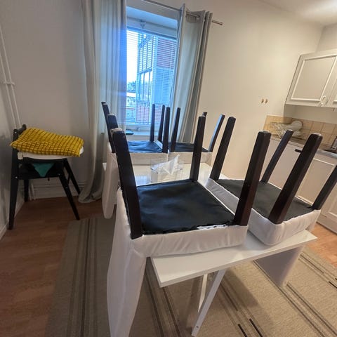 Stolar med stoppad dyna, mkt bra fjädring. Tyget är sand-/guldfärgat. Stadiga, fräscha och riktigt sköna att sitta i. Jättefint skick!