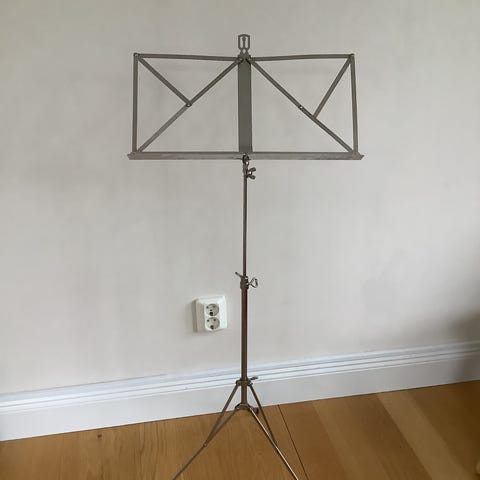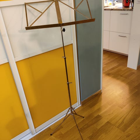 Större notställ. Stabilt. Lätt att höja och sänka och packa upp och ner. Passar att använda till större format av noter.