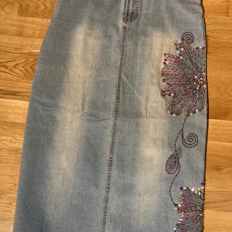 Desigual kjol i blå färg, storlek 40. Tillverkad i denimmaterial med dekorativa detaljer och volangkant. Säljes för inköpspris
