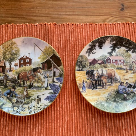 Par med dekorativa väggtallrikar som föreställer ett slott med detaljer i relief. Tallrikarna har en rund form med en ram i rosa och beige toner och är utformade för väggmontering. Passar som dekorativa föremål i hemmet.