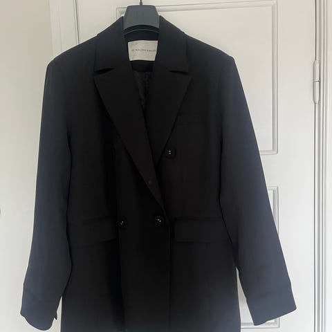 Kavaj för dam i storlek L, svart färg och tillverkad i polyester. Kavajen har dubbelknäppning med guldfärgade knappar och två framfickor.