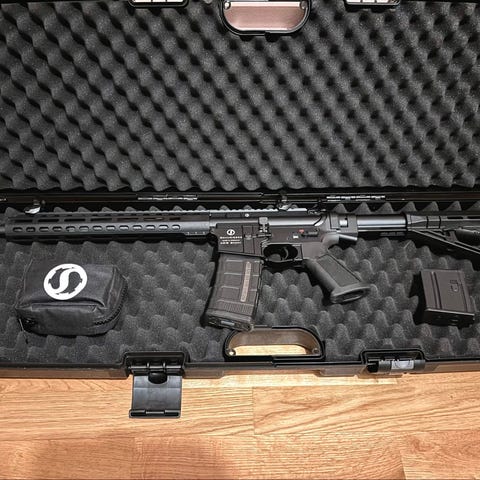 Mid-length (23,5cm) quad rail till AR15 från IMI defense. Friflytande grepp som fäster över och mot vanlig mil-spec pipmutter, med qd-fästen för sling. Ingår även rail-covers, Magpul RVG framgrepp och fäste för sling med krokfäste (hook sling). Suttit på en AR22 en snabb vända innan jag ledsnade på 22lr och bössan såldes. Handguarden är således i nyskick.