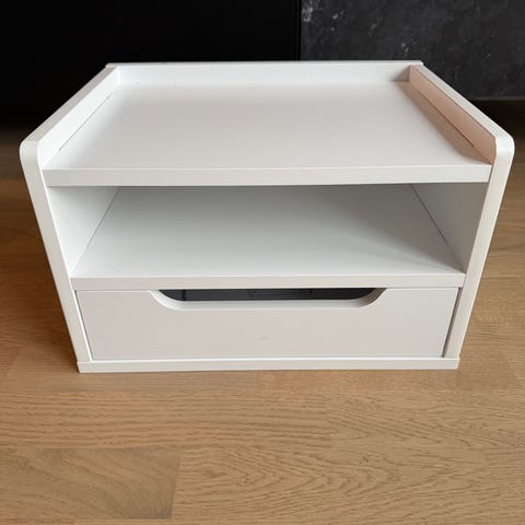 Vägghängda sängbord fanerade med ek. En låda och hylla vardera. Längd 45, djup 34, höjd 19 cm. Endast två skruvar. Fint skick, mindre skada finns se bilder. Kan mötas i Stockholm.