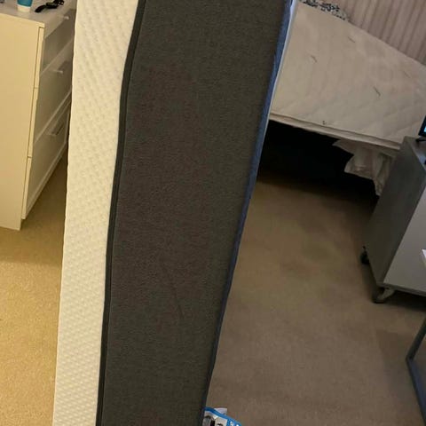 Sängstomme Malm från Ikea. Madrass Sultan Storfors och bäddmadrass Sultan Torsmo båda från Ikea. Madrasserna är 140×200cm. Stora madrassen är 18cm tjock. Bäddmadrassen är 4cm tjock och överdraget på den är avtagbart. Stommen är 156×211cm, höjd 30cm, gaveln är 77cm hög. En bräda under sprucken men lagad se sista bilden. Inget som tidigare märkts av.