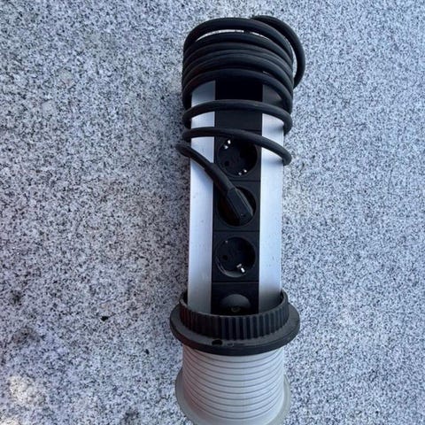 Elpelare med flera eluttag och nätverksanslutningar. Monterad på en pelare med rund stabil bas. Utrustad med elkablar för anslutning och flexibel slang för kabeldragning. Används för att fördela el i verkstäder, kontor eller liknande miljöer.