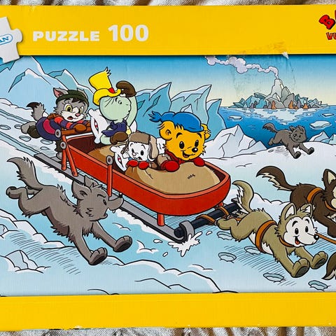 Set med flera barnpussel med olika teman och färgglada illustrationer. Pusslen är anpassade för barn och innehåller olika antal bitar och motiv ( paw patrol, Alfons, Bamse)