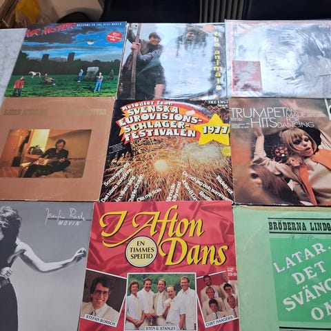 Ett varierat urval av vinylskivor med svenska artister som Lill Lindfors, Evert Taube, Fred Åkerström, Curt Haagers, Ingmar Nordströms Saxparty och många fler. Perfekt för samlare eller musikälskare som vill utforska olika genrer och artister.