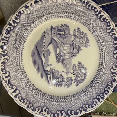 Tallriken har ett dekorativt lila motiv och en mönstrad kant. Passar för servering och som samlarobjekt.