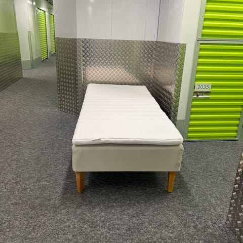 IKEA sängram med madrass i svart färg. Sängramen har en enkel design med metallben och madrassen är anpassad för enkel användning. Passar för sovrum och erbjuder en grundläggande sovplats.