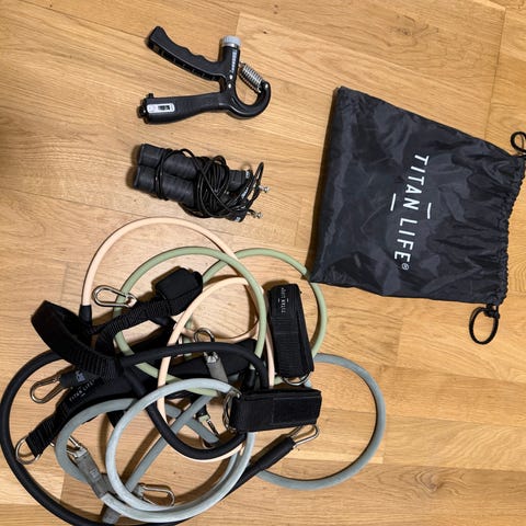Tapout Plyo XT träningsutrustning med olika tillbehör för styrka och kraftträning. Inkluderar motståndsband, handledsremmar, träningsmanual och flera tränings-DVD-skivor - som Är repfria/