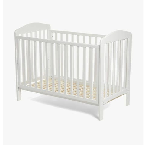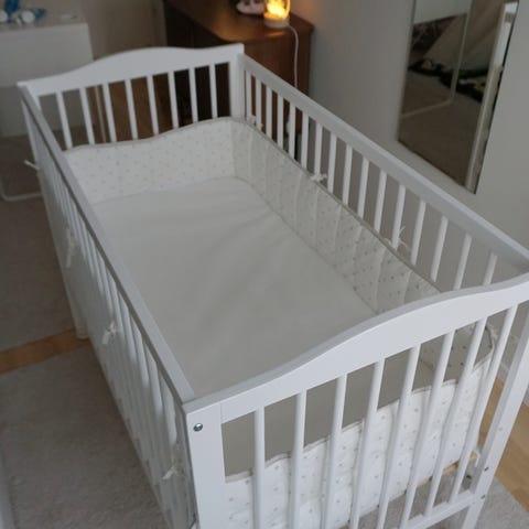JLY Spjälsäng i vit färg. Sängen är avsedd för barn och är tillverkad med säkerhetsanpassade material och design.