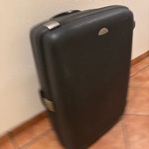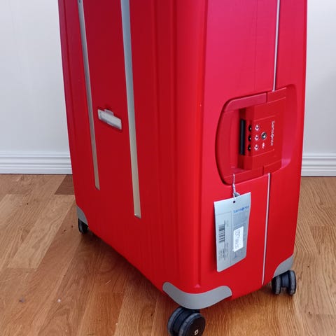 En stor svart Samsoniteresväska i hårdplast, stabil och rymmer mycket. Handtag och hjul på ena sidan, lätt att rulla. Avdelare i väskan och kodlås. Använd ett fåtal gånger.