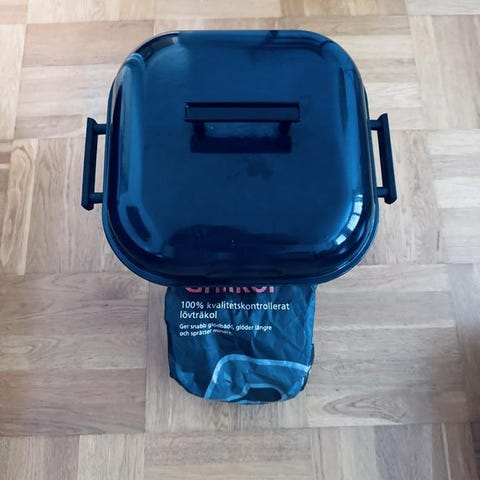 Landmann kolgrill i svart färg med rund form. Grillyta med galler och ventilationsöppningar på locket för reglering av luftflöde. Handtag i trä på locket och sidorna. Stativ med hjul för enkel förflyttning.