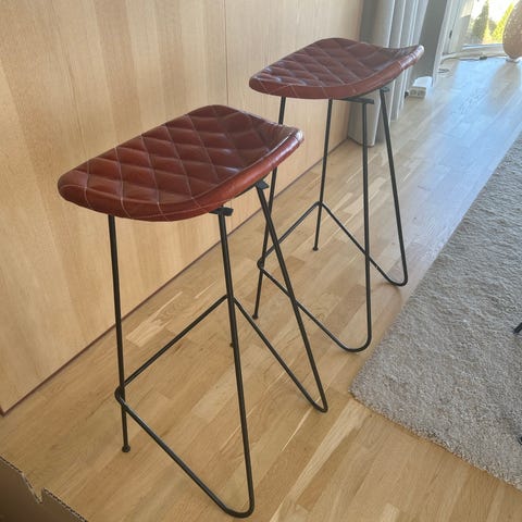 2st svarta barstolar med brun skinnsits, sitthöjd 75cm.
