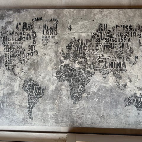 Stor världskarta i canvas på aluminiumram. 200x140 cm.