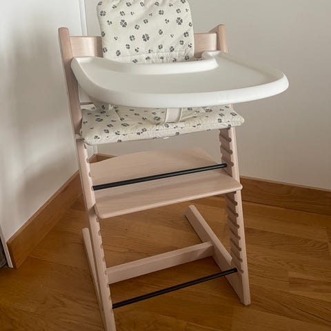 Stokke Tripp Trapp med tillbehör, babyset och bricka. Bra skick.