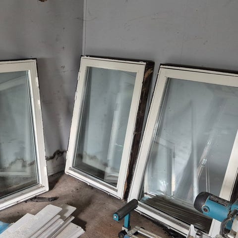 Kulturfönster i trä mått 12x14 som det saknas delar av glas på ena sidan. Andra sidan måste justeras gångjärn.