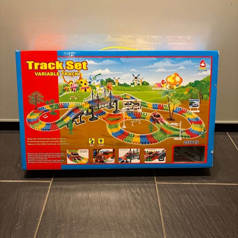 Mycket Flexitrax i medföljande låda. Broar, tunnlar, växlar, korsningar. Går att bygga stora roliga banor. 4 bilar i varierande skick medföljer.
