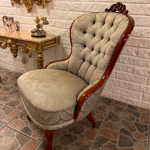 Klassisk emmafåtölj med djuphäftad rygg och dekorativa träsniderier på armstöden.