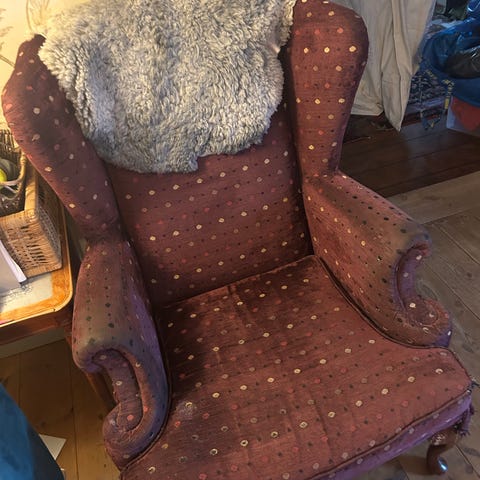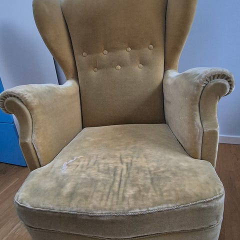 Fåtöljen är väl använd men i bra skick – inga fläckar eller revor, bara normalt slitage.