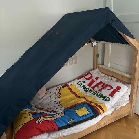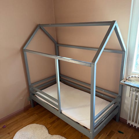 Gedigen hussäng med bäddmått 160x70 cm som vi använt som lekhörna. Vi har tagit bort den nedre främre ramen och fäst en plywoodskiva i den bakre ramen. Ramen medföljer självklart så detta går lätt att återställa för den som vill använda den som säng.