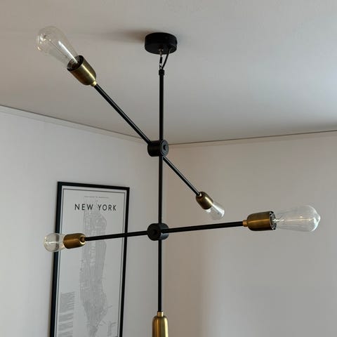 Det finns ganska mycket vajer och kabel kvar så den går att sänka en bra bit om man vill, är nu ca 75 cm från tak till lägsta punkten. Utan lampor.