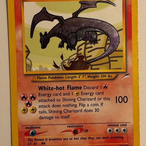 Pokémon Shining Charizard samlarkort med 100 HP och White-hot Flame attack som gör 100 skada. Kortet är av typen Basic Pokémon och har holografisk design med stjärnmönster i bakgrunden.