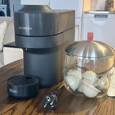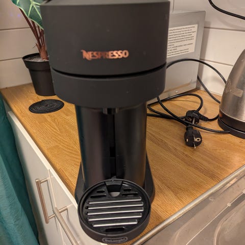 Nespresso vertuo kaffemaskin. Maskinen är designad för att brygga kaffe med kapslar och har en kompakt modell med en vattenbehållare på baksidan. Bra skick!