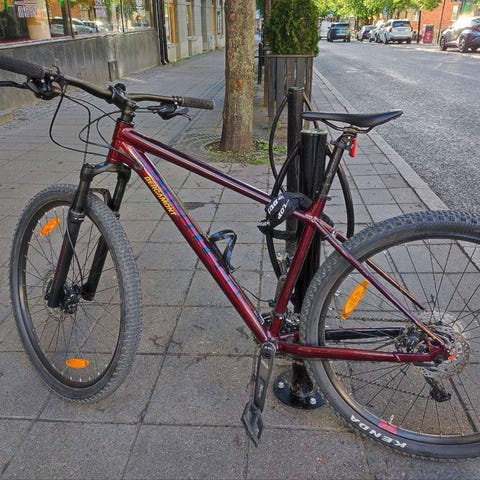 Cykeln är anpassad för terrängkörning och har en robust konstruktion som passar för olika typer av underlag.