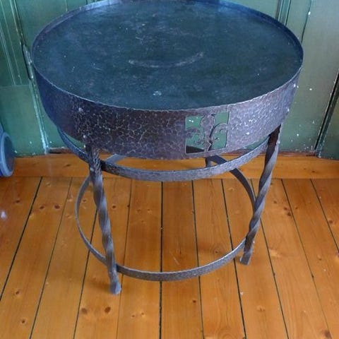 Koppargryta med metallstativ. Rund form med en diameter 69 cm. Höjd med stativ 45 cm. Höjd utan stativ 30 cm.