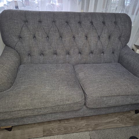 Ena 2 sitsen har ett hål nertil samt 3 sitsen har haft ett brot på träramen framtill som är lagad.