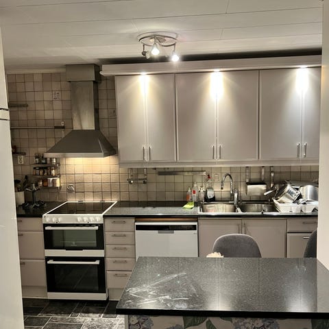 Stadiga ock bra skåp behöver lite kärlek på ytskiktet, spis och fläkt ca 6år gamla. Ikea bänkskiva, mått 4,24m. Inga ben eller socklar finns då det var platsbyggt
