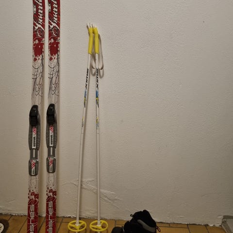 Längdskidor 110 cm, Pjäxor strl 29 eller 31 och stavar