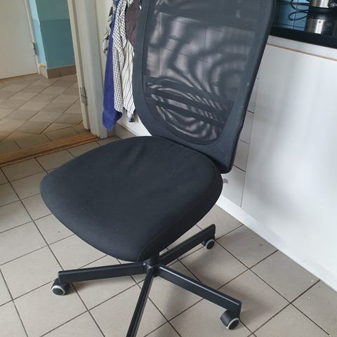 Konstläder på toppen av ryggstödet och längst fram på sittdynan. Övrigt är tyg.