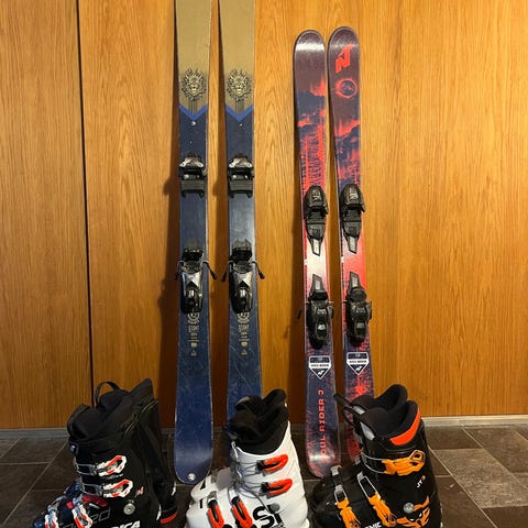 Twintip-skidor 129 cm, pjäxor 22 + 23-23,5 cm