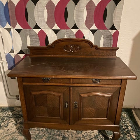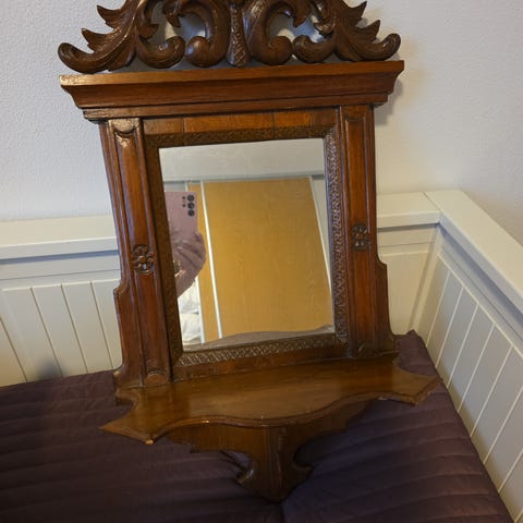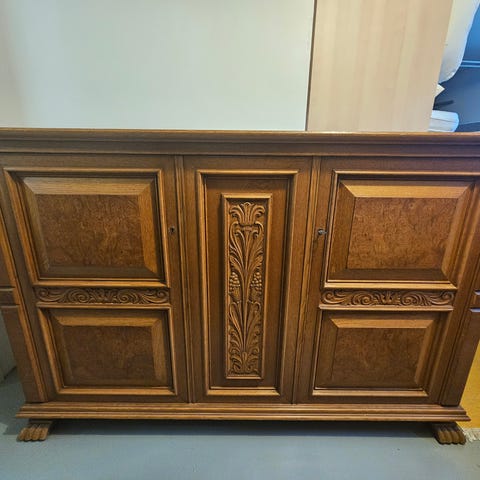 Antik skänk i trä med tre dörrar och en övre hylla med spegel. Skänken har dekorativa sniderier och detaljer i trä, inklusive en snidad mittdekoration ovanför spegeln. Möbeln är avsedd för förvaring och kan användas i olika rum som vardagsrum eller matsal.