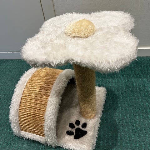 Mycket fin mysig kattkoja med lurviga liggplatser. Två stora klösbrädor på sidorna. Inköpt på Rusta 2025 nypris 499kr