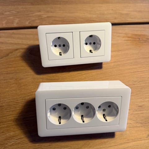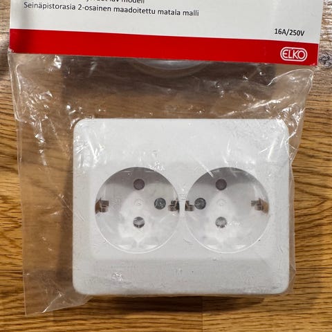 Tre utanpåliggande vägguttag med dubbel uttag i vit färg, ett Elko och två RS. Passar för installation i vägg. Produkterna är avsedd för fast installation och har standardiserade uttag för elanslutning.