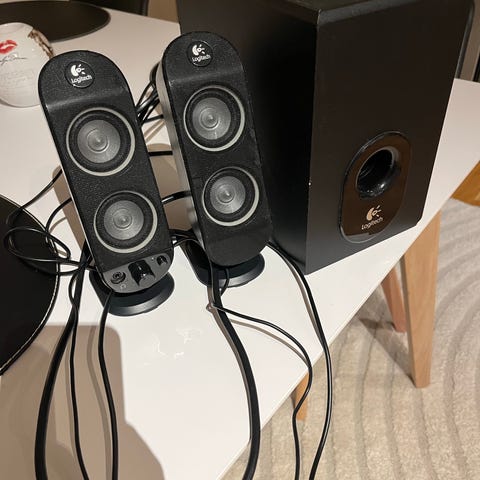 Logitech X-530 högtalarsystem med flera satellithögtalare och en subwoofer. Systemet är svart och inkluderar anslutningskablar för ljudingång. Passar för användning med datorer eller andra ljudenheter som stödjer 3,5 mm ljudanslutning om en adapter köps till