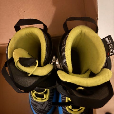 Raptor Ishockeyskridskor i barnstorlek 32. Skridskorna är svarta med blå detaljer och har snörning samt spänne för justering. Designade för ishockey och anpassade för barn.