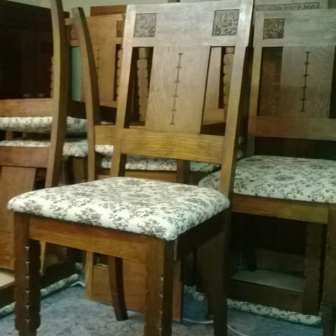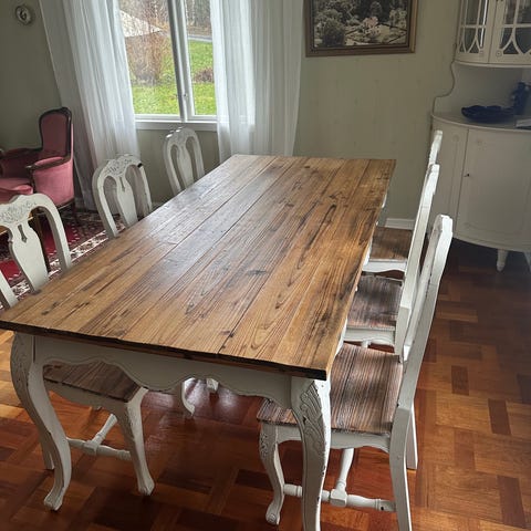 Trevlig matgrupp med 6 stoppade stolar. Bordet har en praktisk låda på var sida.