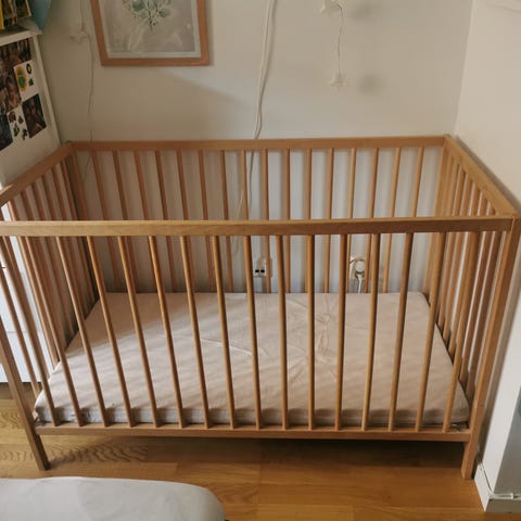 IKEA SNIGLAR spjälsäng i trä med naturlig träfärg (bok). Ingår även madrass, madrasskydd och två sängöverdrag. Vissa skavmärken efter små vassa tänder, som kan slipas bort (se bild).