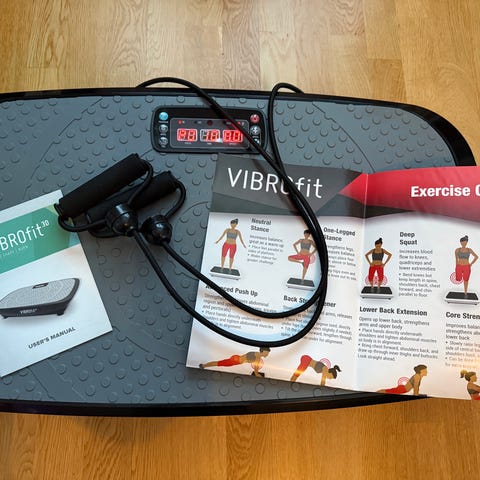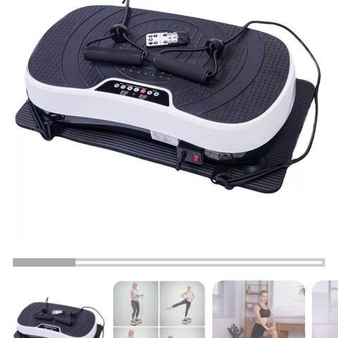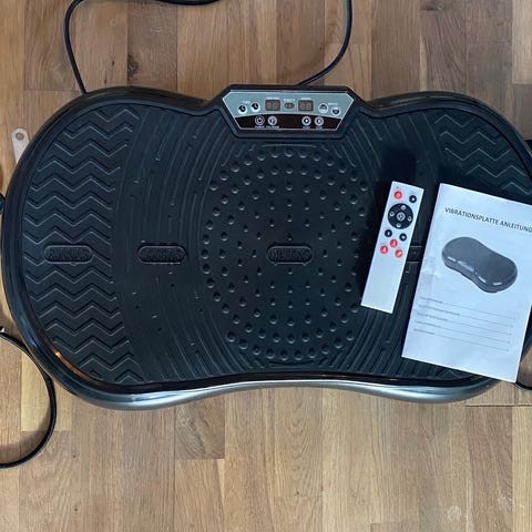 Vibrationsplatta med plattform för fotställning och remmar att sätta runt t.ex midja eller höft. Utrustad med kontrollpanel för inställning av vibrationer. Används för träning och muskelstimulering.