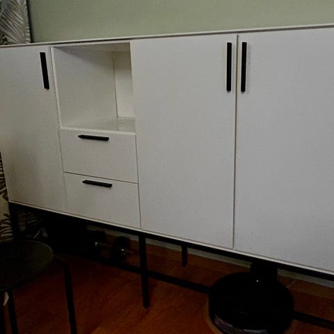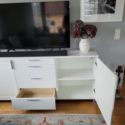 Säljer en mycket fin och praktisk skänk/sideboard inköpt på Svenssons. Vit matt färg. 3 lådor och 2 skåp. Förberett för kabeldragning i bakkant i båda skåpen. Inköpt för 13.400 kr.