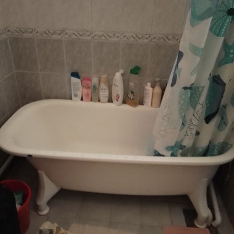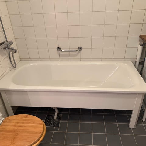 Badkar i vit färg med standardstorlek. Passar för badrum med kaklade väggar och golv. Enkel design med två lättare repor.