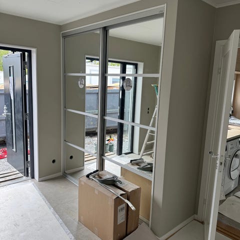 Hela garderoben säljes komplett med dörrar och finns just nu i en lägenhet 8trappor upp. Spegeldörrarna går ej in i hissen och behöver därav bäras ner för dessa trappor.